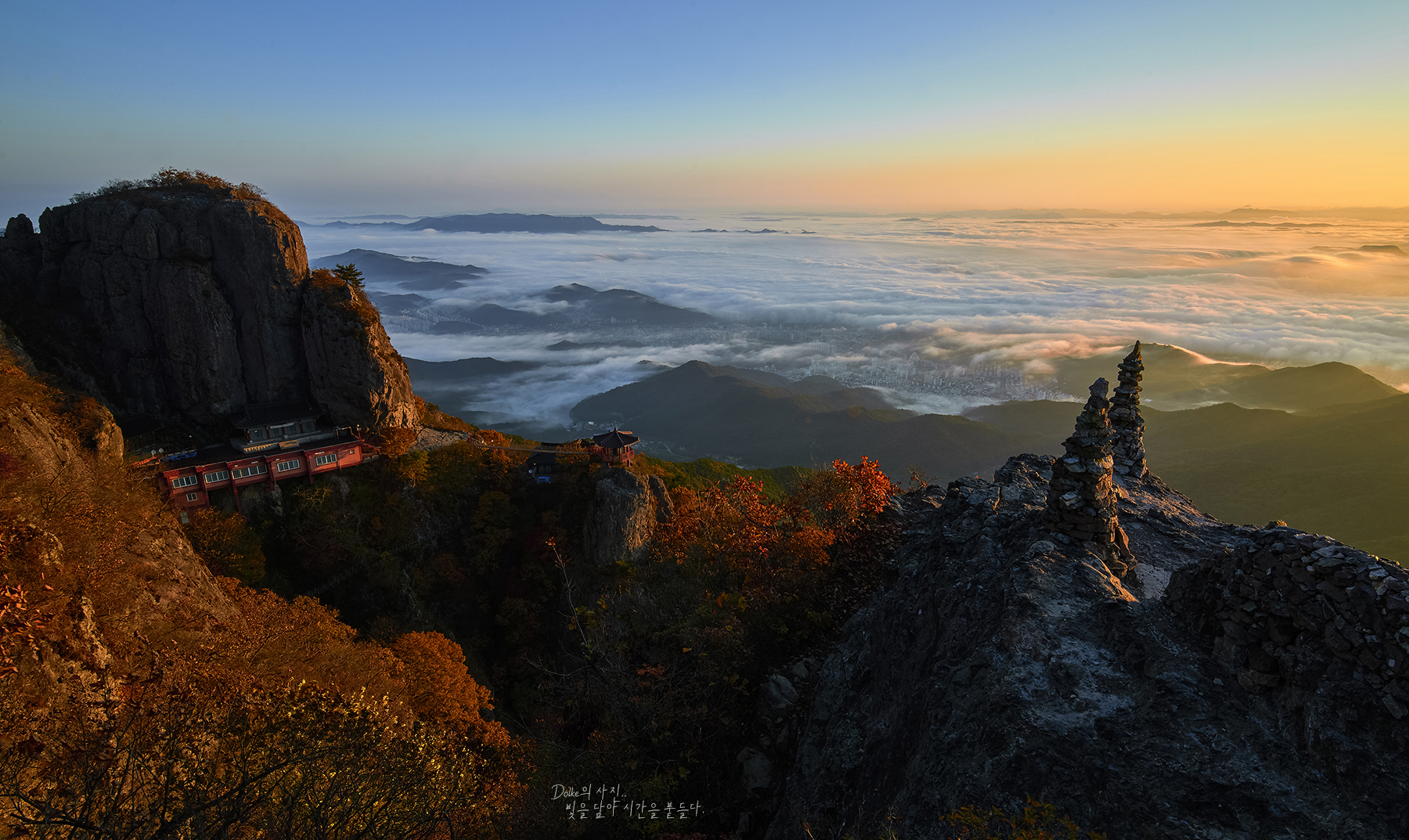 나는 산 정상에서서 경직된 몸을 조금은 편안히 풀어내며, 밝아지는 여명과 함께 나에게 주어진 짧은 이 시간 만큼은 저 화려한 운무를 한껏 즐긴다.